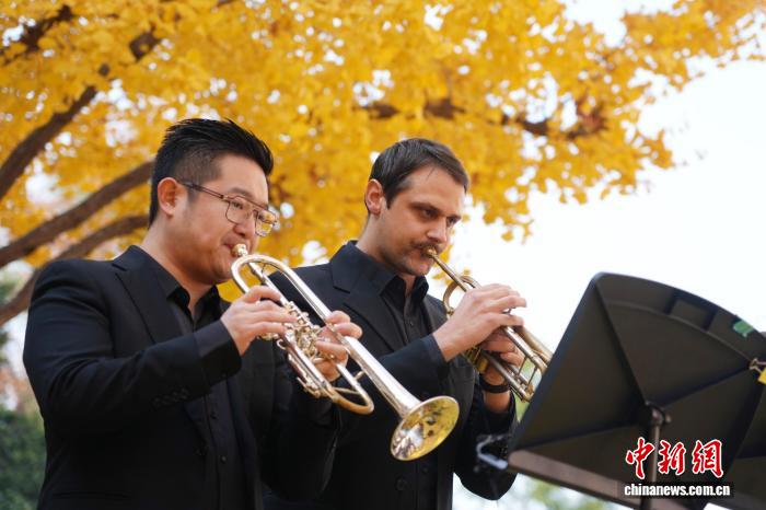 图为音乐家吹响“金色军号”。中新社记者 弛亨伟 摄图为圆号吹奏家韩小亮指引乐队。中新社记者 弛亨伟 摄图为意年夜利小号吹奏家斯特凡是诺·弗推伊巴僧(左)尾次上台银杏音乐会。中新社记者 弛亨伟 摄图为市平易近正在银杏林中倾听“铜管衰宴”。中新社记者 弛亨伟 摄图为小同伙享用银杏树停的冬季狂放。中新社记者 弛亨伟 摄